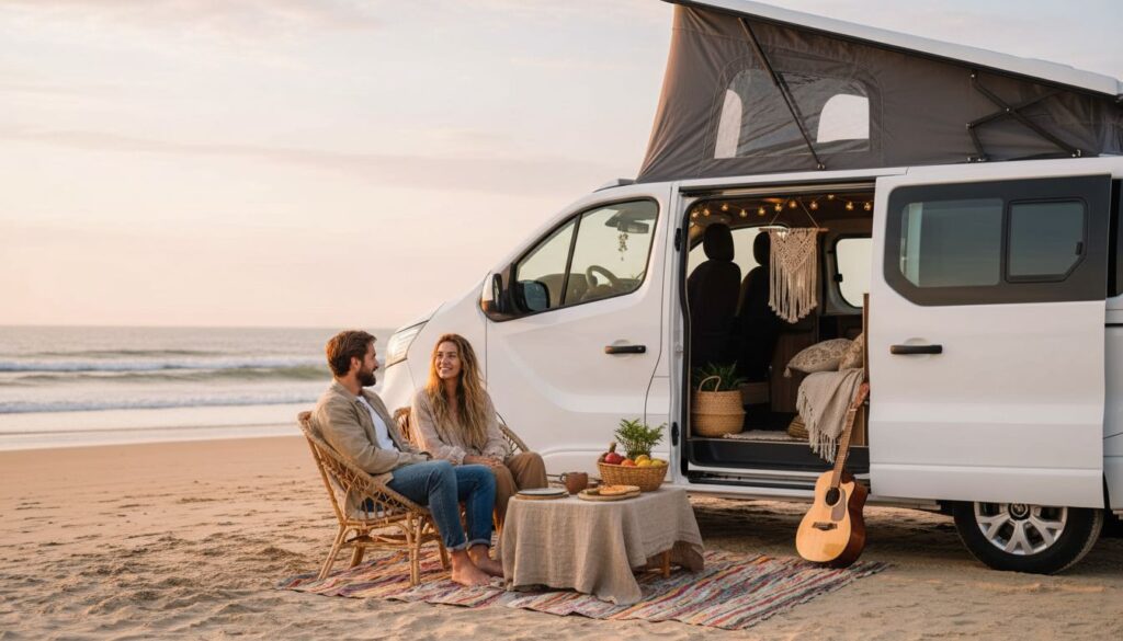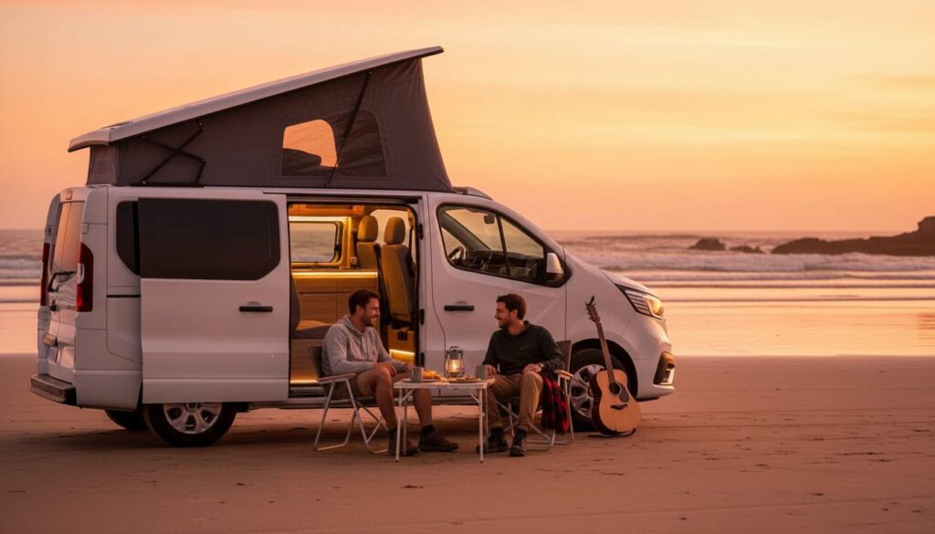 Le van adopte une philosophie différente avec un aménagement compact mais ingénieux. Les équipements modernes incluent désormais une kitchenette complète, des couchages confortables pour 2 à 4 personnes selon les modèles, une batterie auxiliaire puissante, des panneaux solaires, et diverses connectivités. La douche est souvent extérieure pour optimiser l’espace intérieur.